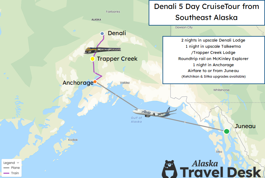 Alaska Travel Desk, Juneau’s travel experts, offer this exciting adventure to Denali that times perfect with your cruise in and out of Juneau or Sitka. The rate calendar below will outline if this tour starts before OR after your cruise in Juneau/Sitka (and if you’ve already booked your airfare to Alaska – that’s OK too, we can help move your flights around at no additional charge!). Our Denali Adventure add-on is perfect for guests on the Seabourn Encore, The Boat Company, UnCruise, Nat Geo, and American Cruiselines!